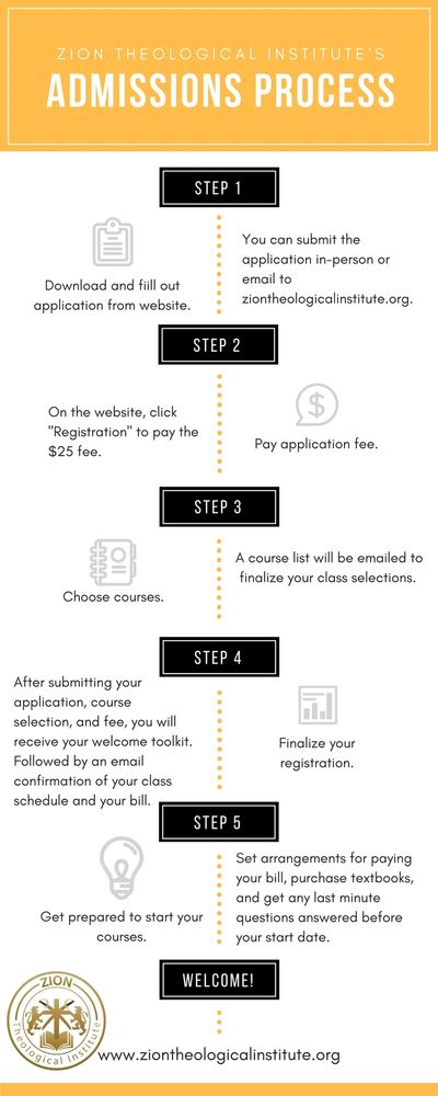 Please download your application, type in your information and email to ziontheologicalinstitute@gmail.com. Click here to pay your $25 non-refundable application fee. (Special Note: Contingent upon your program, additional application materials may be required)